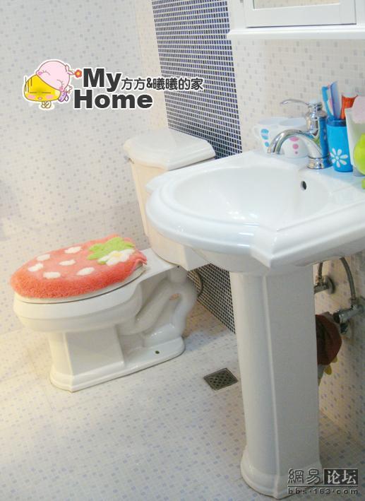 衛(wèi)生間:粉蘭色的衛(wèi)生間,顯得比較整潔