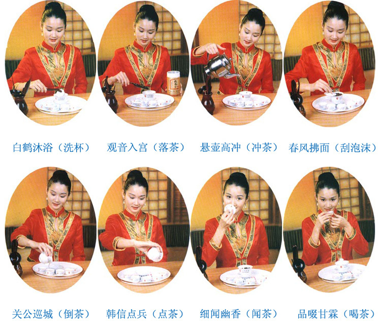????1.特色:針對較粗制的茶,使價格不高的一般茶葉能泡出不凡的風味。講究一氣呵成,在泡茶過程中不允許說話,盡量避免干擾,使精、氣、神三者達到統一的境界。對于茶具的選用,動作,時間以及茶湯的變化都有極高的要求。(類似于日本茶道,只比其遜于對器具的選用)
