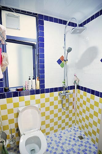 衛生間用藍色、黃色、白色的小方磚拼出靚麗的墻面,地面用藍白兩色的馬賽克鋪成,墻上還用四色小方磚做成拼花,與臥室門上的圖案相呼應。
