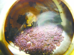 大家將茶品把玩了許久,討論了許久,甚至用高倍的放大鏡觀察了許久,最后茶干品還是被放入了那極品紫砂壺,注入了專門到40公里開外的深山老泉取的水,煮沸了的蟹眼水,幾秒鐘的工夫,干茶就吸飽了水,大家眼前一亮,發現本來是鐵銹紅的茶顏色一下子發出黑油油的亮光,結成團塊沉到壺底。