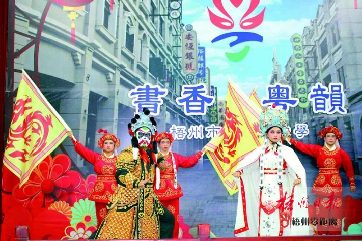 市第十一中學的學生正在進行粵劇表演。 作為全國中華優秀傳統文化傳承學校、自治區非物質文化遺產傳承教育示范學校,市第十一中學以傳承粵劇文化為特色,傳承梧州救國話劇社的愛國精神,用粵劇唱響新時代、新梧州的風采。 (市第十一中學供圖)