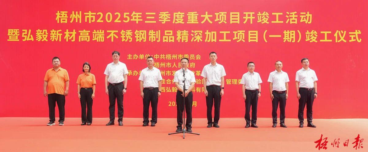 梧州零距離網-梧州日報訊(記者 陳雨燕)8月26日,梧州市2025年三季度重大項目開竣工活動暨弘毅新材高端不銹鋼制品精深加工項目(一期)竣工儀式在粵桂合作特別試驗區(qū)舉行。市委書記蔣連生出席活動并宣布項目竣工。