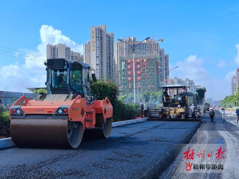 9月11日,在蒼海大道,施工人員和車輛正在鋪設瀝青路面。梧州日報記者 李鴻榮 攝