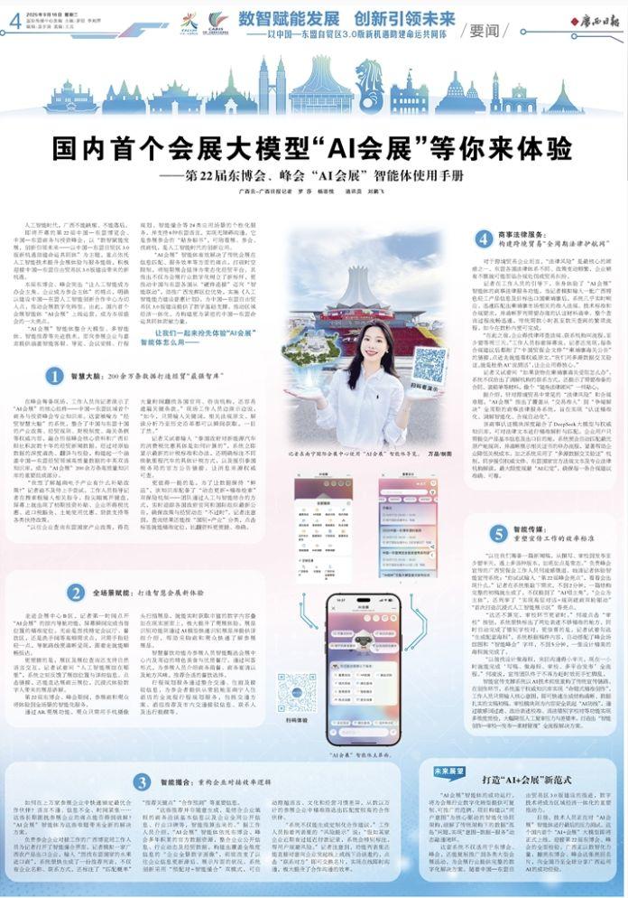 本屆東博會(huì)、峰會(huì)突出“讓人工智能成為辦會(huì)主角、企業(yè)成為參會(huì)主體”的特點(diǎn),明確以建設(shè)中國(guó)—東盟人工智能創(chuàng)新合作中心為切入點(diǎn),推動(dòng)會(huì)展數(shù)字化轉(zhuǎn)型。由此,國(guó)內(nèi)首個(gè)會(huì)展智能體“AI會(huì)展”上線運(yùn)營(yíng),成為本屆盛會(huì)的一大亮點(diǎn)。