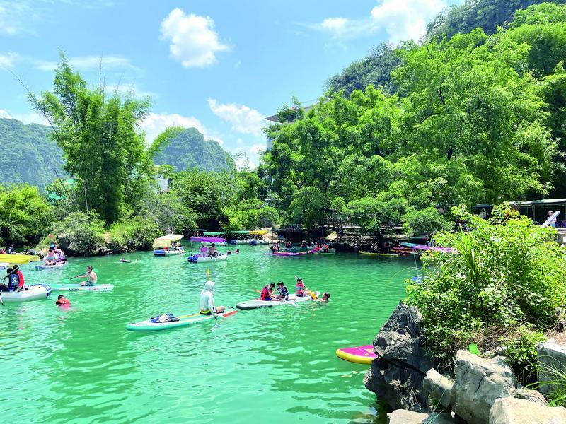 都安民風淳樸,人們熱情開朗。在這里,民宿的老板們會開心地招呼游客,鼓勵自助式飲食和玩樂,例如租船和劃板不收押金,看上哪個項目按價格自行掃碼取走,玩好了自動物歸原位,免費提供救生衣和小孩的游泳圈。吃飯也是提前點單,按約定好的時間過來,餐具自行從消毒柜取或者拿統一的套裝消毒碗筷,白飯白粥一般隨意吃,消費價格都較低,物美價廉。用民宿老板的話說,一年就做一季的生意,收貴了就沒有人來玩了。