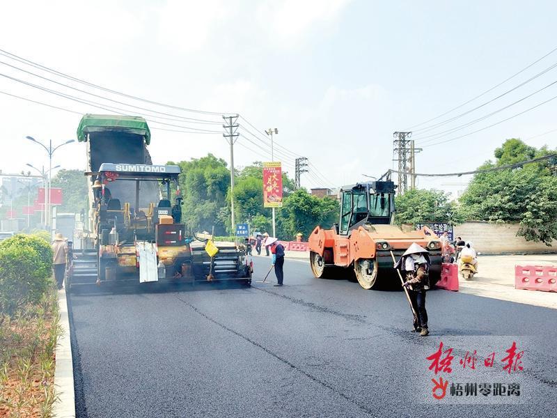 10月11日,在蒼海大道社學路口附近,施工車輛正在鋪設瀝青路面。