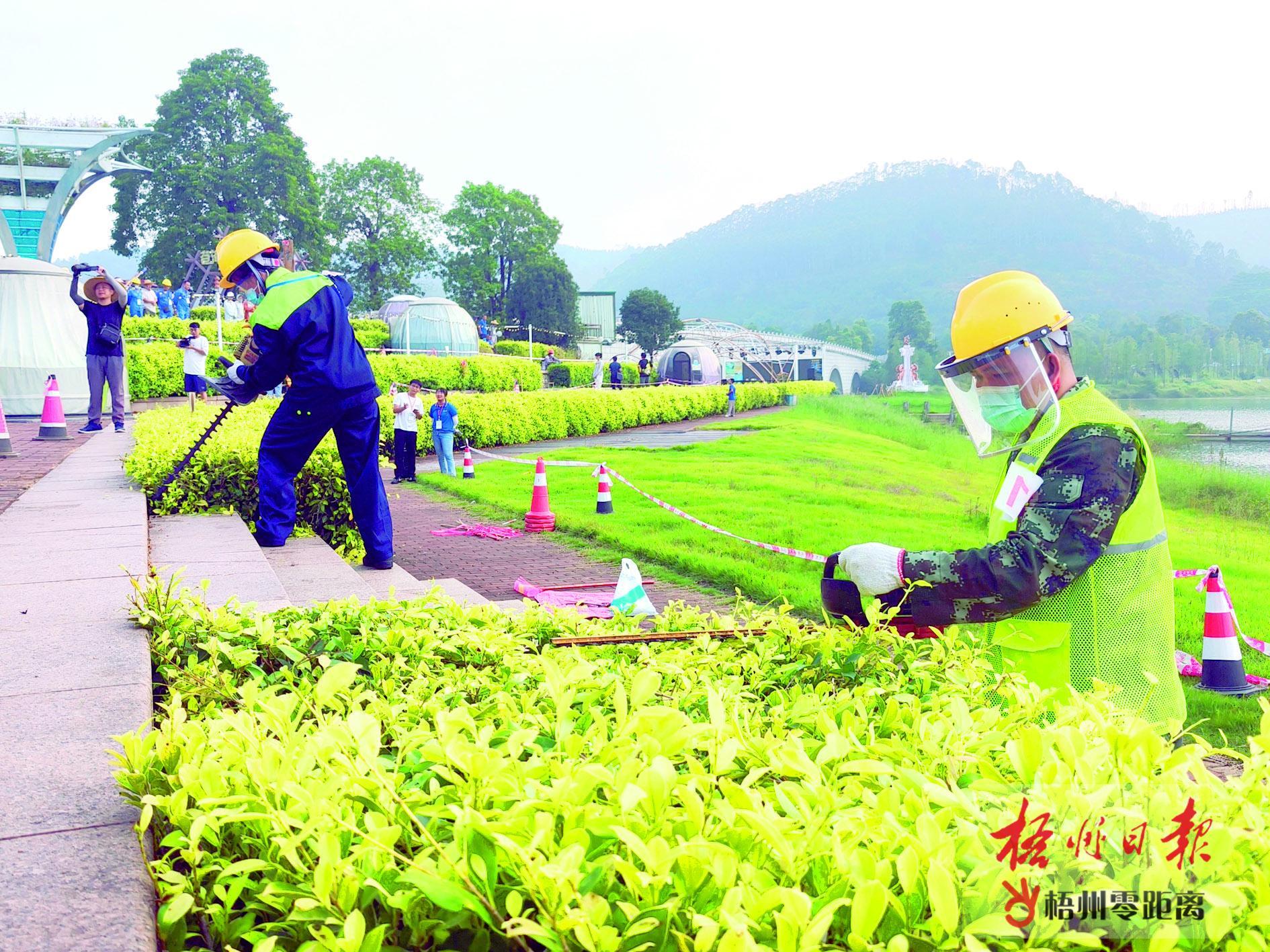 10月11日,在2025年梧州市園林綠化行業(yè)職工技能大賽中,選手們參加綠籬修剪比賽。梧州日?qǐng)?bào)記者 李鴻榮 攝