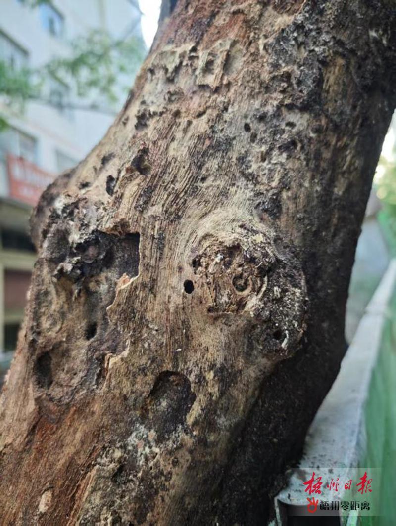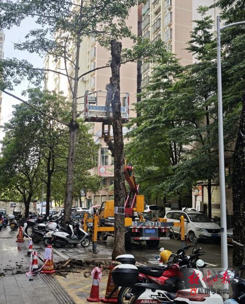 梧州零距離網-梧州日報訊 近日,龍圩區龍圩鎮龍騰社區網格員接到居民反映,麗源居小區后門的一棵樹木受病蟲害影響嚴重枯萎,樹木枝干出現斷裂跡象。這不僅影響了小區的綠化,更成了懸在居民頭頂的安全隱患,大家路過時都提心吊膽。