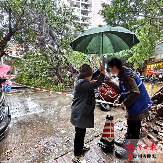 社區(qū)接報(bào)后迅速響應(yīng),第一時(shí)間安排網(wǎng)格員趕往現(xiàn)場,在相關(guān)區(qū)域周邊拉起警戒線,并疏導(dǎo)過往車輛與行人,嚴(yán)防意外發(fā)生。同時(shí),社區(qū)將相關(guān)情況上報(bào)富民街道。街道接報(bào)后立即聯(lián)系萬秀區(qū)城鄉(xiāng)建設(shè)和城市管理監(jiān)督局、紫荊花園物業(yè)管理部等部門,各方展開緊急會(huì)商,確定砍伐清理方案,確保盡快恢復(fù)道路通行。