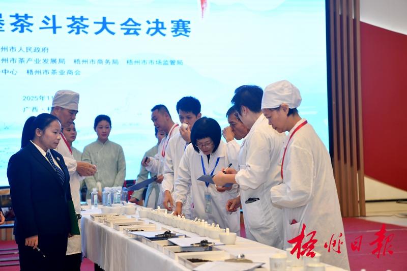 11月12日,“茗戰(zhàn)四方 香傳天下”2025年六堡茶斗茶大會決賽在市黨群服務中心舉行,專家評委和大眾評委仔細品鑒參賽茶樣。記者 李鴻榮 攝
