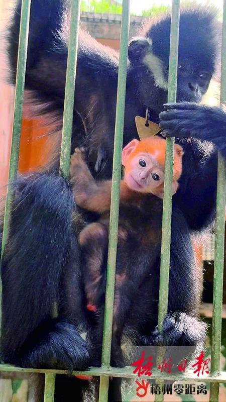 在市黑葉猴保護研究中心,新出生的猴幼崽毛發呈橙黃色,憨態可掬。記者 吳艷虹 攝